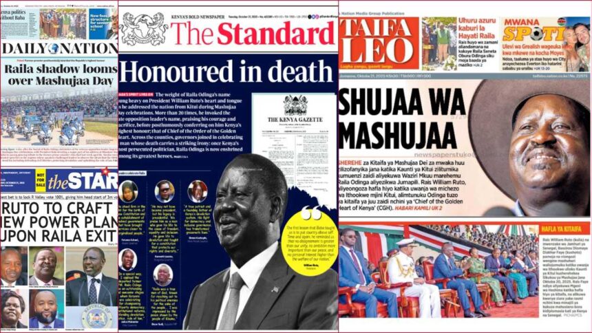 The newspapers on Tuesday, October 21, reported on the posthumous honours given to the late Raila Odinga during the Mashujaa Day celebrations.