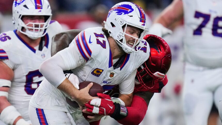 Allen took consecutive sacks on the Bills’ final possession, leading to a fourth-and-27, but Buffalo gained 44 yards on a short pass from Allen to Josh Palmer, who tossed a lateral to Khalil Shakir.