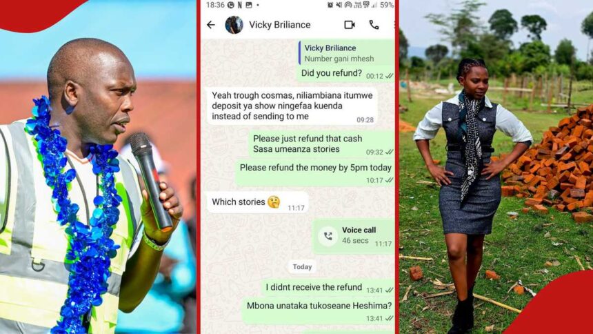 - The politician leaked their WhatsApp chats showing that he demanded that Brilliance refund KSh 50,000 after she failed to show up for the tournament