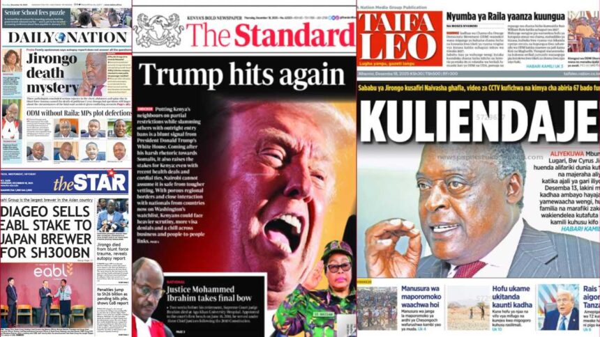The newspapers on Thursday, December 18, reported on various topics, with the mysterious death of former Lugari MP Cyrus Jirongo dominating the papers.