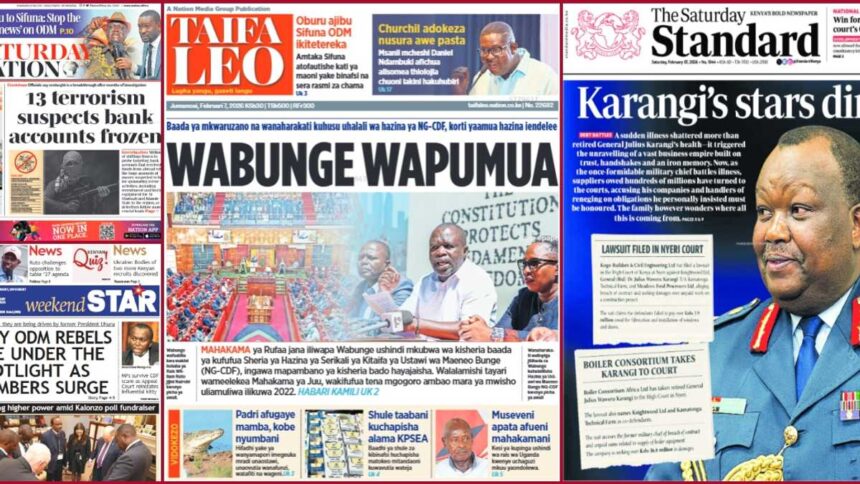 On Saturday, February 7, local papers highlighted nationwide developments, focusing on ODM’s internal disputes and the Court of Appeal overturning the High Court’s ruling that NG-CDF was unconstitutional, sparking debate.