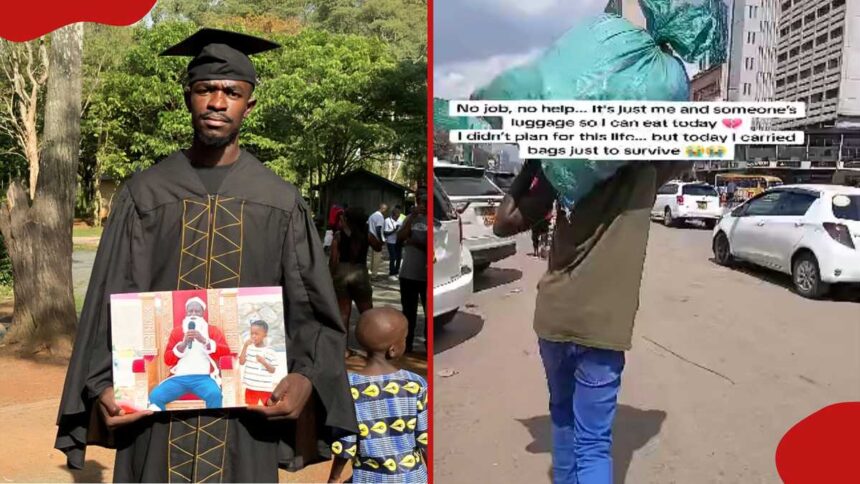 A Kenyatta University graduate has turned to carrying luggage in Nairobi’s Central Business District (CBD) after struggling to land a job.