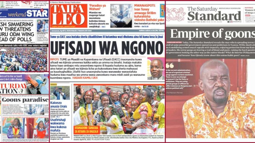 On Saturday, April 11, local newspapers spotlighted rising political intolerance, with hired goons increasingly shaping confrontations across rival camps, with the recent attack on Vihiga senator Godfrey Osotsi underscoring the growing tensions as the 2027 General Election draws closer.